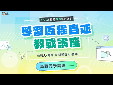 高三學習歷程自述與多元表現綜整心得如何撰寫? 讓台科大-海龜學長、陽交大-晉瑜學長,親自分享學檔準備技巧! 同場也有104職涯教育-王榮春老師Spring分享唷~點我觀看: -------------------------------------------------- 別忘記搭配使用以下104工具助你一臂之力 ✨104學習歷程:https://tw104.pse.is/5xqevp ✨104升學就業地圖:https://tw104.pse.is/5xqfjm ✨104Campus:https://tw104.pse.is/5ylrle 104學習歷程特邀講座,祝福大家順利考上理想大學&校系!