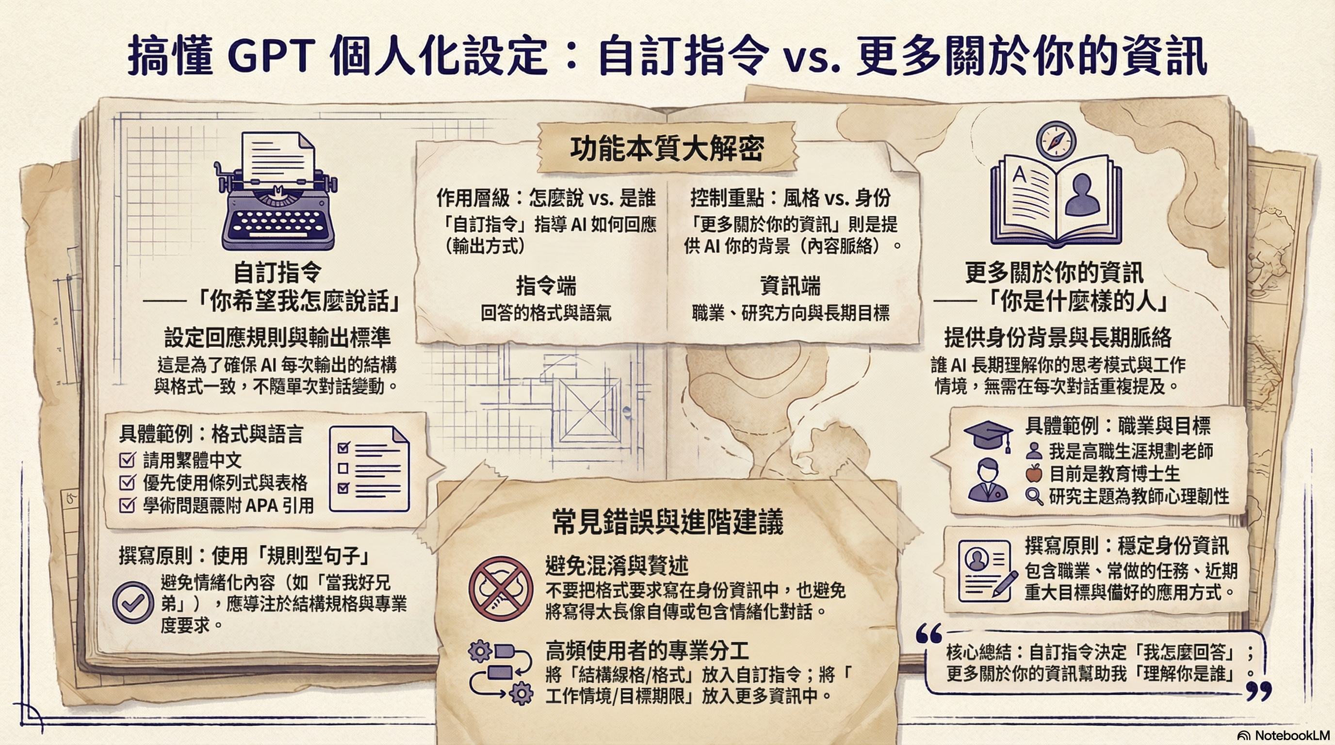 「自訂指令」與「更多關於你的資訊」功能不同、用途也不同。